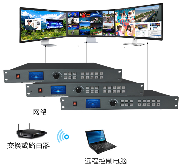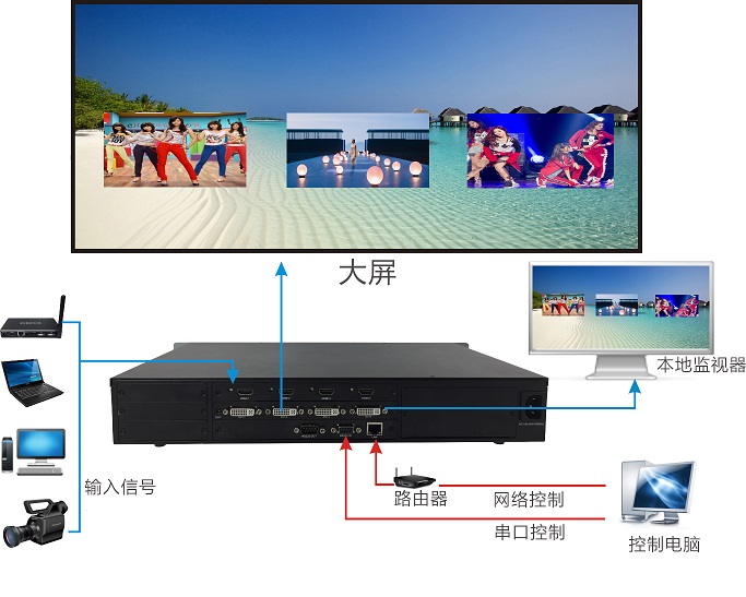 应用场景:适合单台显示设备多个画面的应用,是安防监控、广播电视 、视频会议、指挥中心、媒体多功能厅等领域多画面显示的理想之选。输出支持LED、LCD大屏显示。