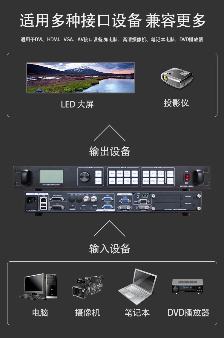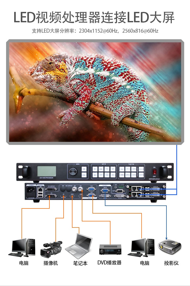 为用户设计了多个实用的输出分辨率,常用分辨率最宽的达 3840 点,最高的达 1920 点,适用各种点阵显示屏。多达 20 多种的输出分辨率供用户选择,并可调整到点对点输出;客户还可以根据实际的需求,定制出所需的分辨率。