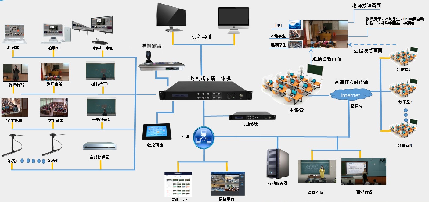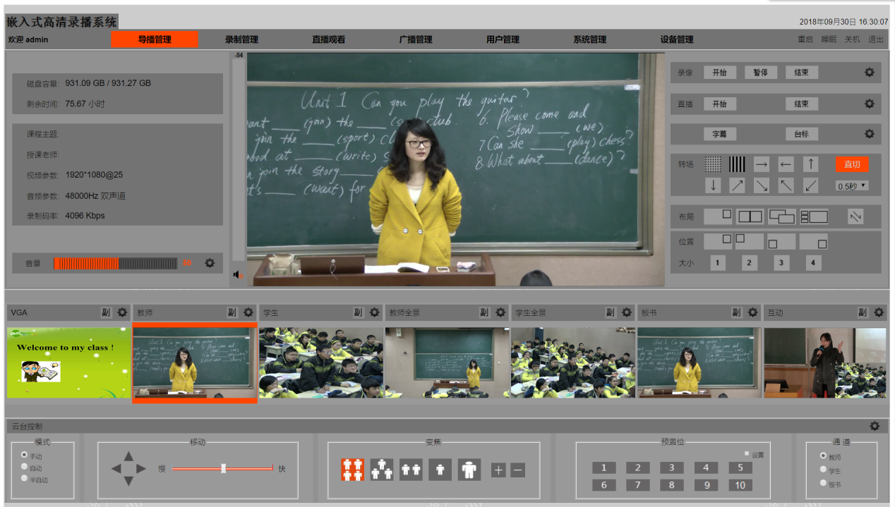 15、B/S架构导播平台,集视频导播监视、切换、音频调整、录制/直播、开始暂停结束等控制,特技效果、特效字幕、LOGO校徽、片头片尾设置,云台控制,跟踪设置,录制观看、直播监视等功能;