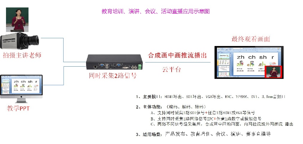 ◆输入信号:1路HDMI/VGA/DVI/CVBS/YPBPR+1路SDI接口输入,或者2路网络IP摄像机输入,(SDI/HDMI/CVBS/BNC/VGA接口带环出,单独IP输出,支持2 路IP流同时输出)。