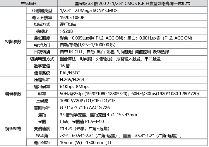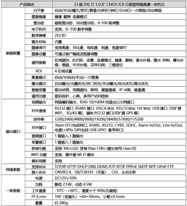 传感器类型 1/2.8” 2.0Mega SONY CMOS 最大分辨率 1920×1080P 扫描方式 逐行扫描 信噪比 >52dB 最低照度 彩色:0.005Lux@( F1.2, AGC ON);黑白:0.001Lux@(F1.2, AGC ON) 电子快门 自动/手动(1/25~1/100000秒) 日夜转换 自带IR-CUT,自动 黑白 彩色 时间延迟 阈值控制 反转选择 切换断定方式 图像算法,时间段,外部触发,报警输入触发,串口触发 数字变倍 16倍 信号系统 PAL/NSTC