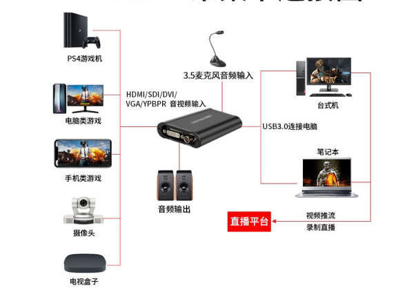 派尼珂NK-160VGA-USB3是一款全能高清视频接口(DVI/SDI/VGA/HDMI/色差YPbPr)转USB3.0视频全能采集器(盒),具有高性能、高兼容性、免驱动、无需单独供电,体积小,便携式安装,方便携带等优点。连接笔记本或台式机USB或者其他USB输入设备采接口,在视频会议软件或者直播软件上即可显示高清图像,它可以1080P/60HZ的HDMI、DVI(VGA、YPbPr)和SDI的音视频输入信号(会议摄像机或者直播录播摄像机),转出成USB3.01080P/60HZ的高清视频,无压缩,实时转换,广播级画质。它还支持外部独立模拟音频输入(调音台或者全向拾音器、话筒信号等音频信号源),可以选择模拟或数字音频信号来捕获。产品可兼容Windows, Linux, Mac OS X操作系统和USB3.0接口,兼容USB3.0芯片组(Intel,Renesas,ASMedia,Fresco Logic等)。全能采集盒满足UVC和UAC标准,无需安装驱动和设置,即插即用,方便使用。