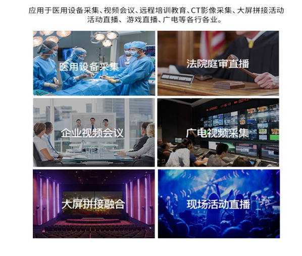 应用领域:高清视频会议、多媒体视频中心、商业发布会、直播演唱会、真人秀节目、户外商业活动、流媒体直播、手术医疗、教学录播、户外广告直播、婚庆现场直播、高精度的专业图像处理多媒体压缩等研究开发应用领域。